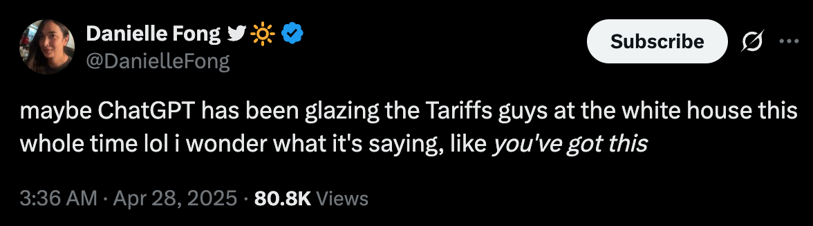 This is extremely dangerous. The optimistic outcome of an overly sycophantic model is mass psychosis that makes social media look like a golden retriever. A world in which AI leads people to bankruptcy. Or confirms somebody’s desire to kill themself. Or somebody else. Or, if the person is stupid enough, put on self-destructive tariffs.